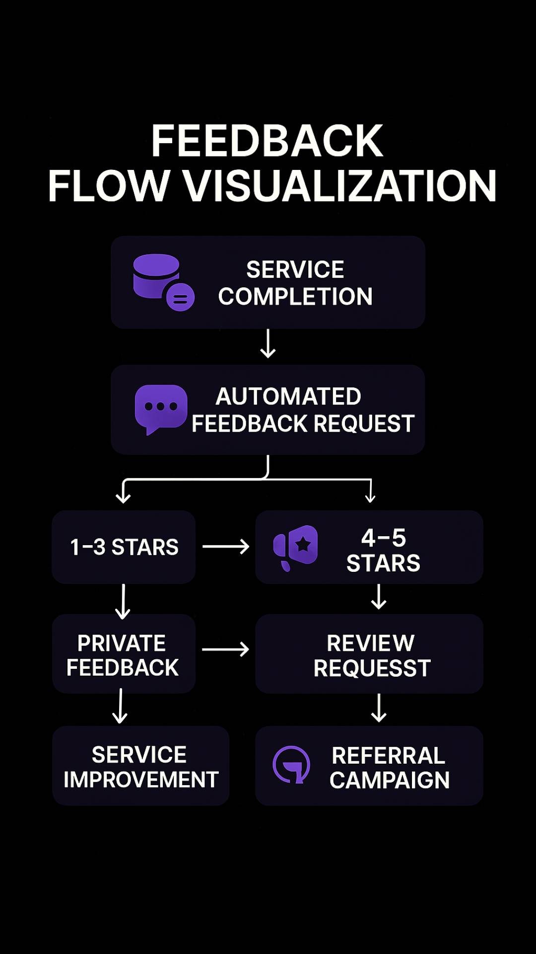 Automated Feedback Loop: After each service, the system automatically requests feedback, filters positive responses (4-5 stars) for public reviews, and privately collects negative feedback (1-3 stars) for internal improvement.